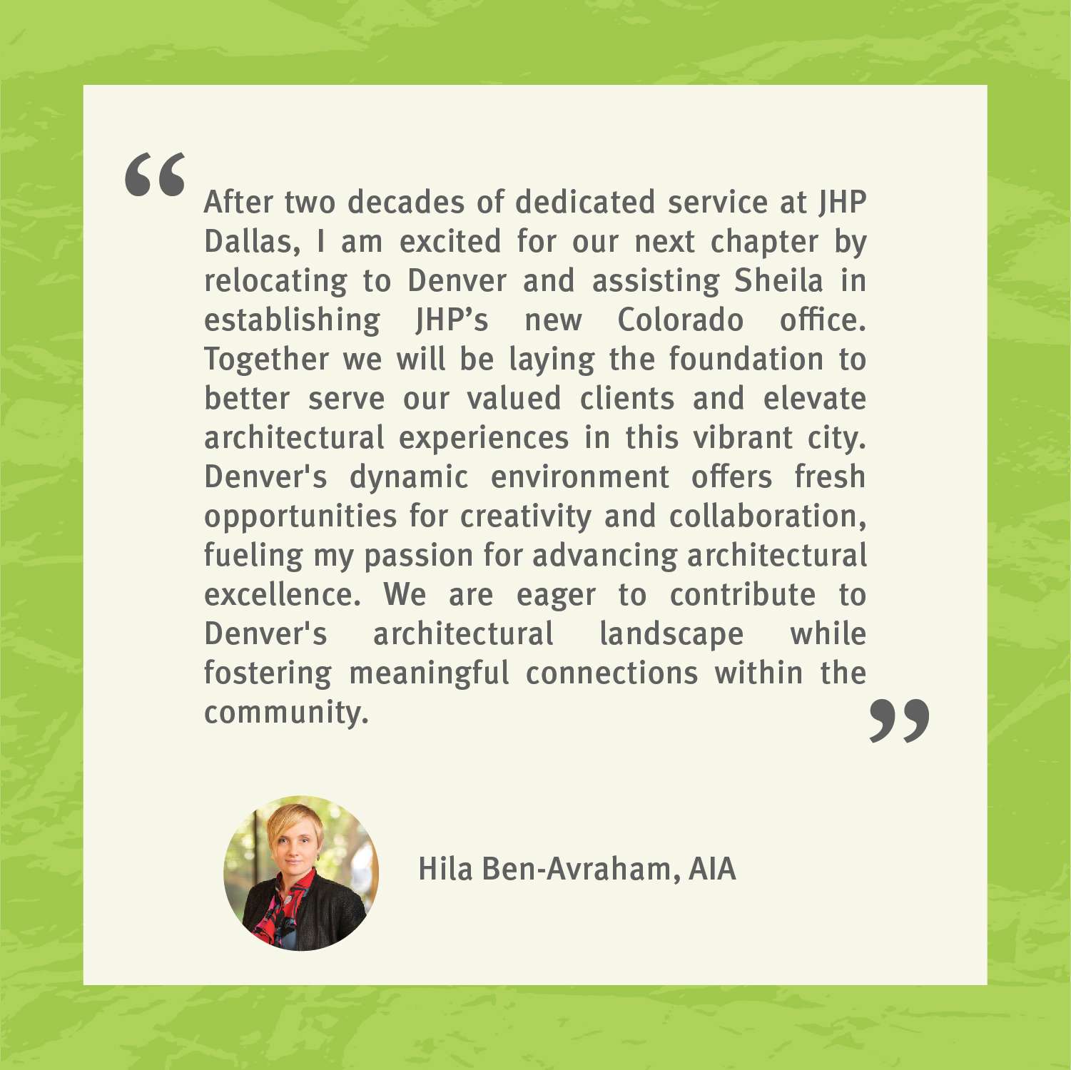 JHP is heading West! Dallas, Texas has been our home since the beginning, and will continue to be our homebase. After 45 years we are expanding our reach by adding a second office to our JHP family. We’re excited to announce the launch of the JHP Denver, Colorado office, which will be led by Principal Sheila Kneifl, AIA and Senior Associate Hila Ben-Avraham, AIA, expanding our geographic reach into the West and solidifying JHP’s position as a national practice. We are eager to connect with all our current clients and consultants, and develop new relationships.