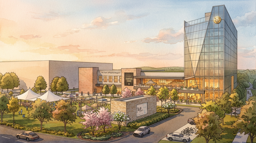 When a Rocky Mountain university set out to explore a new hotel with an embedded School of Hospitality and Resort Planning, JHP Hospitality Studio answered with a vision that reached far beyond a single building. The proposal delivers an experiential, hospitality-driven “stay and play” concept–one that reshapes the campus into a more connected, welcoming place. At its heart, Champion Square becomes the everyday stage, where student life, art, and athletics converge in a flexible outdoor room. A teaching hotel anchors the experience, pairing a guest tower with gathering spaces, meetings, and open-air dining that flows naturally into the campus. Together, learning becomes lived–intuitive, spirited, and unmistakably of its place.
