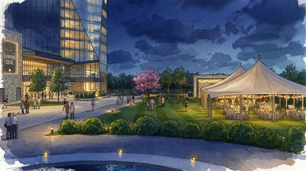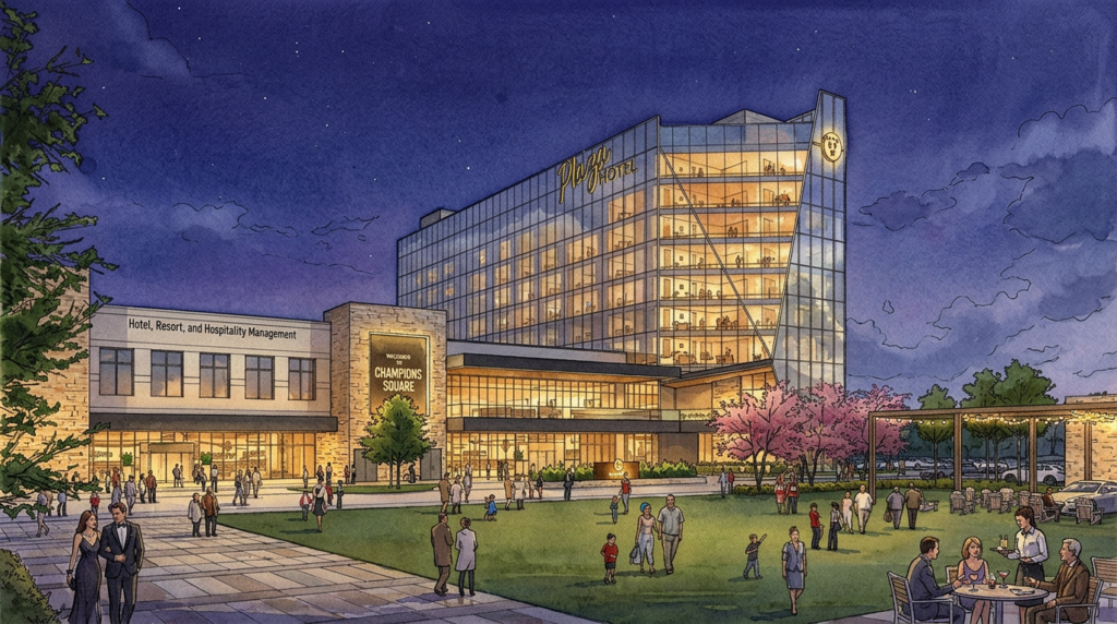 JHP proposed a Stay + Play concept that positions hospitality as a shared campus and community experience. Organized around Champion Square, a central celebration plaza, the plan connects the hotel, world-class performing arts spaces, and athletic facilities into a cohesive, walkable district that supports student life, events, and public engagement.