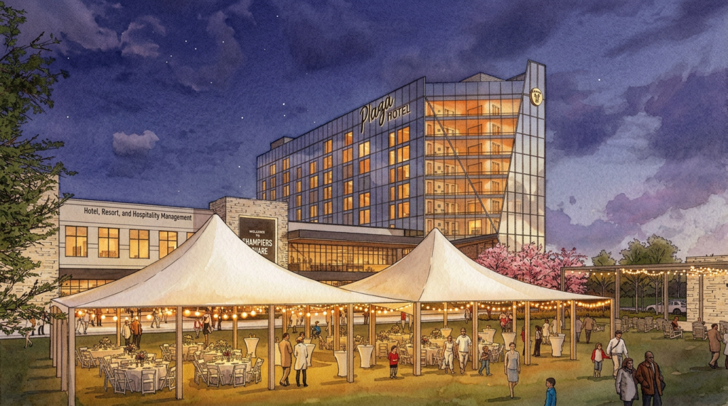 The proposed hotel acts as both destination and catalyst–supporting guests and conventions while accelerating momentum for the university–s arts and athletics programs. The concept establishes a cohesive campus model that strengthens identity, supports experiential hospitality education, and preserves the academic core.
