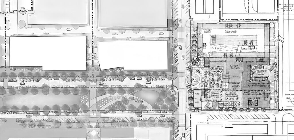 JHP re-envisions the block as a flexible, high-performance hospitality hub. The speculative concept layers public space, adaptable meeting venues, and activated ground-level programming that extend into the surrounding streetscape. Architecture and planning are conceived to frame plazas, reinforce transit connectivity, and support a wide range of uses—positioning the hotel as both social catalyst and urban anchor.