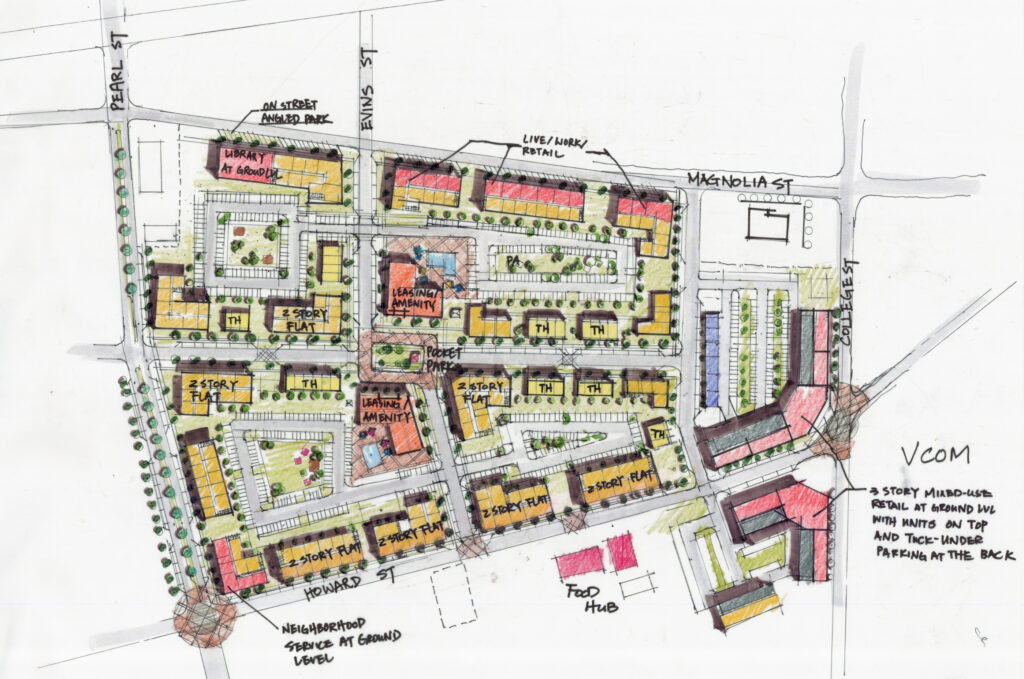JHP served as lead urban planner for the Northside Neighborhood Transformation, partnering with a redevelopment team led by Columbia Residential under a HUD Choice Neighborhoods Grant to support comprehensive neighborhood planning in Spartanburg, South Carolina. The approximately 400-acre historic textile mill community, located just north of downtown and adjacent to Wofford College, was shaped through a community-driven process of workshops, design charrettes, and stakeholder interviews. The resulting master plan provides a reinvestment framework that respects historic character while introducing strategic street reconnections, traffic calming, and context-sensitive mixed-use development scaled to the neighborhood.