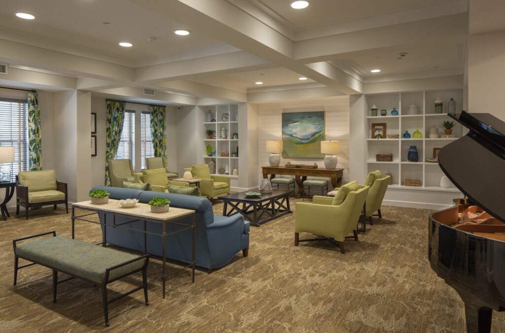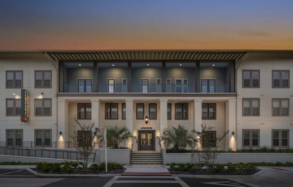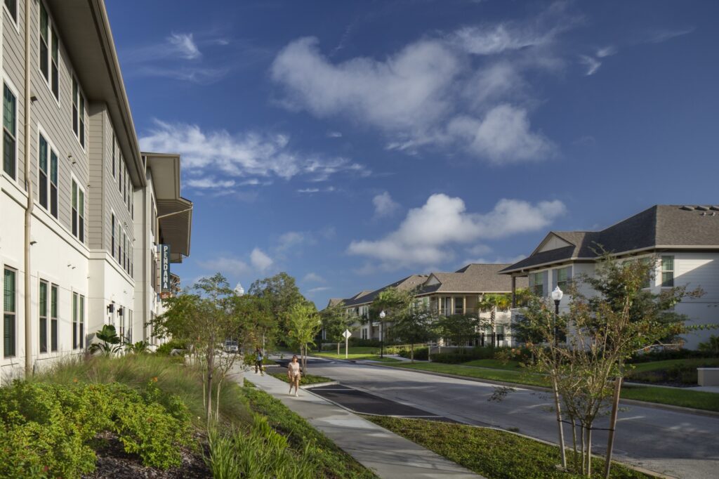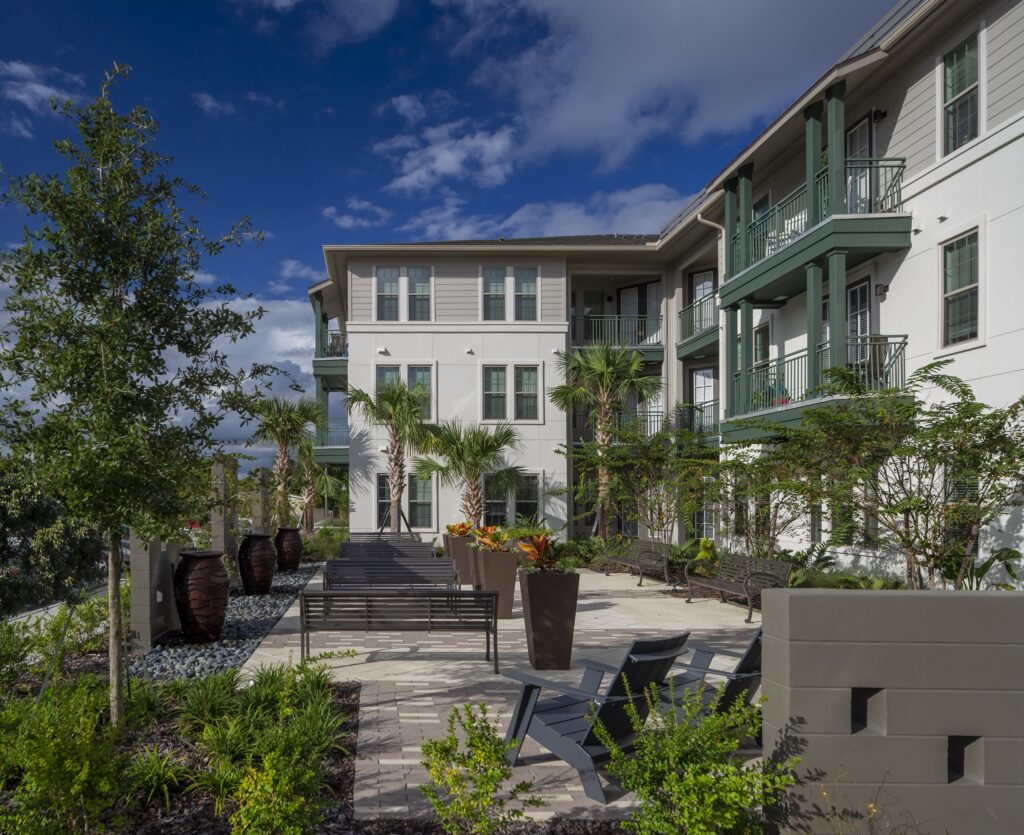 The design responds to Central Florida’s climate and the needs of senior residents through architecture influenced by South Florida and Caribbean precedents. Deep overhangs and balconies provide shade, weather protection, and outdoor living space, while a restrained palette of soft neutrals allows landscaping and gardens to define the community’s character.