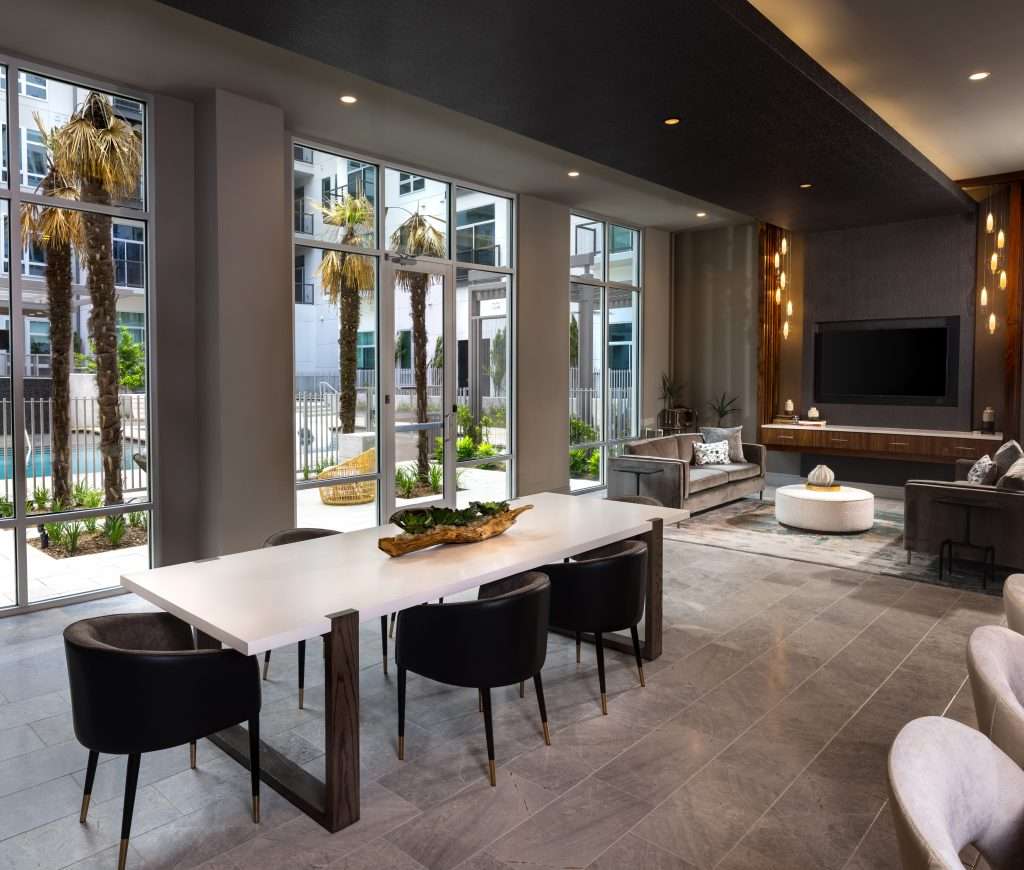 The upgraded entry lobby not only compliments the surrounding luxury retail spaces, but also provide the residents an elevated experience at Instrata. The residential lounge pulls the incoming residents to the space while the internalized pool courtyard serves as an outdoor lounge space, thus creating a balanced indoor-outdoor relationship. A courtyard between the two allows for a seamless transition from inside to outside. The overall layout and design of this space really integrates the site and allows for a luxurious comfort with the needed residential privacy.