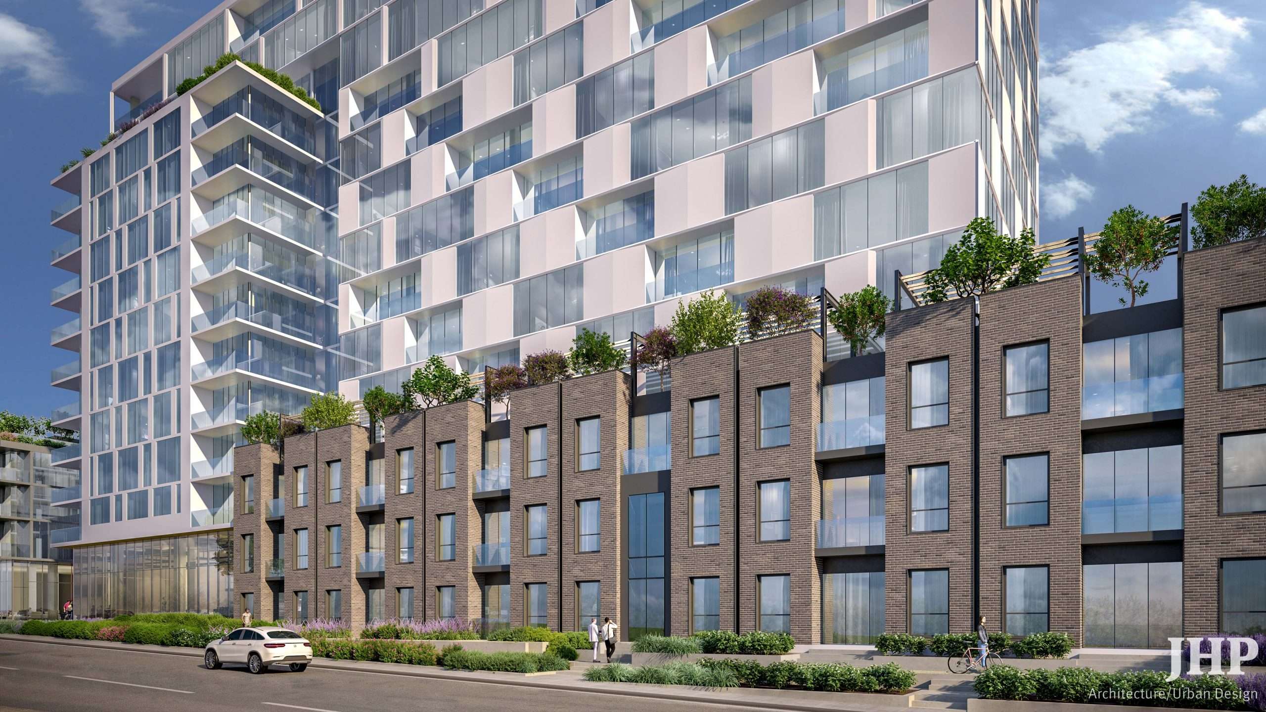 The zoning for the site was for four-story buildings consisting of housing over a two-story garage structure. However, this was inadequate to meet the demand for the number of units. While the developer, Chartwell Residential, was hesitant to increase stories because of the added expense, the design team showed how to capitalize on the zoning constraints for the footprint and construct a 14-story tower that would ultimately pay for itself — even though it was more expensive to build from the outset. The increased height enhanced the green spaces added later, creating a “garden in the sky.”